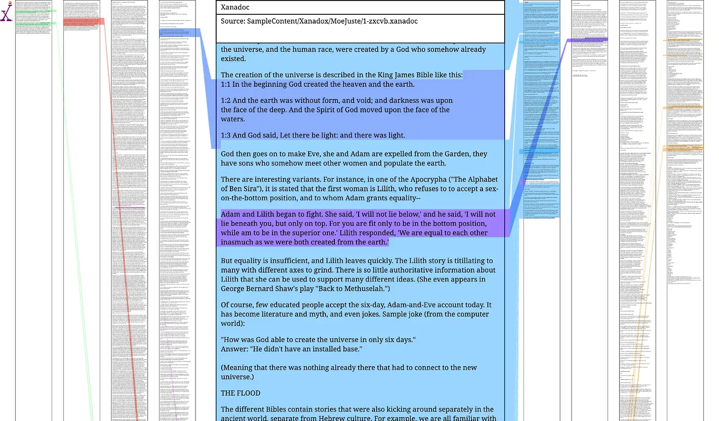 Visually, it could draw inspiration from Ted Nelson’s Xanadu concept, where documents maintain visible, persistent connections to their sources.